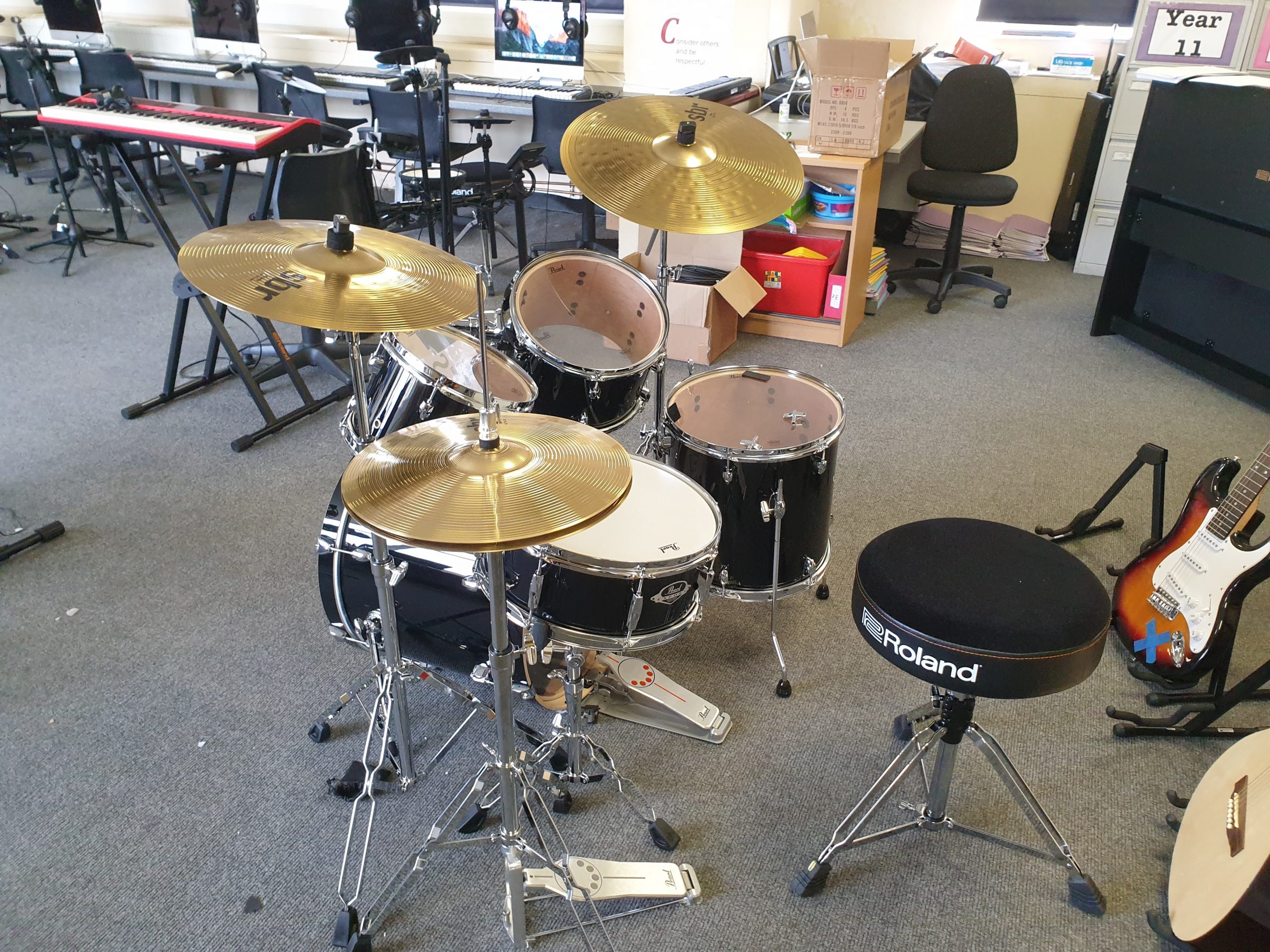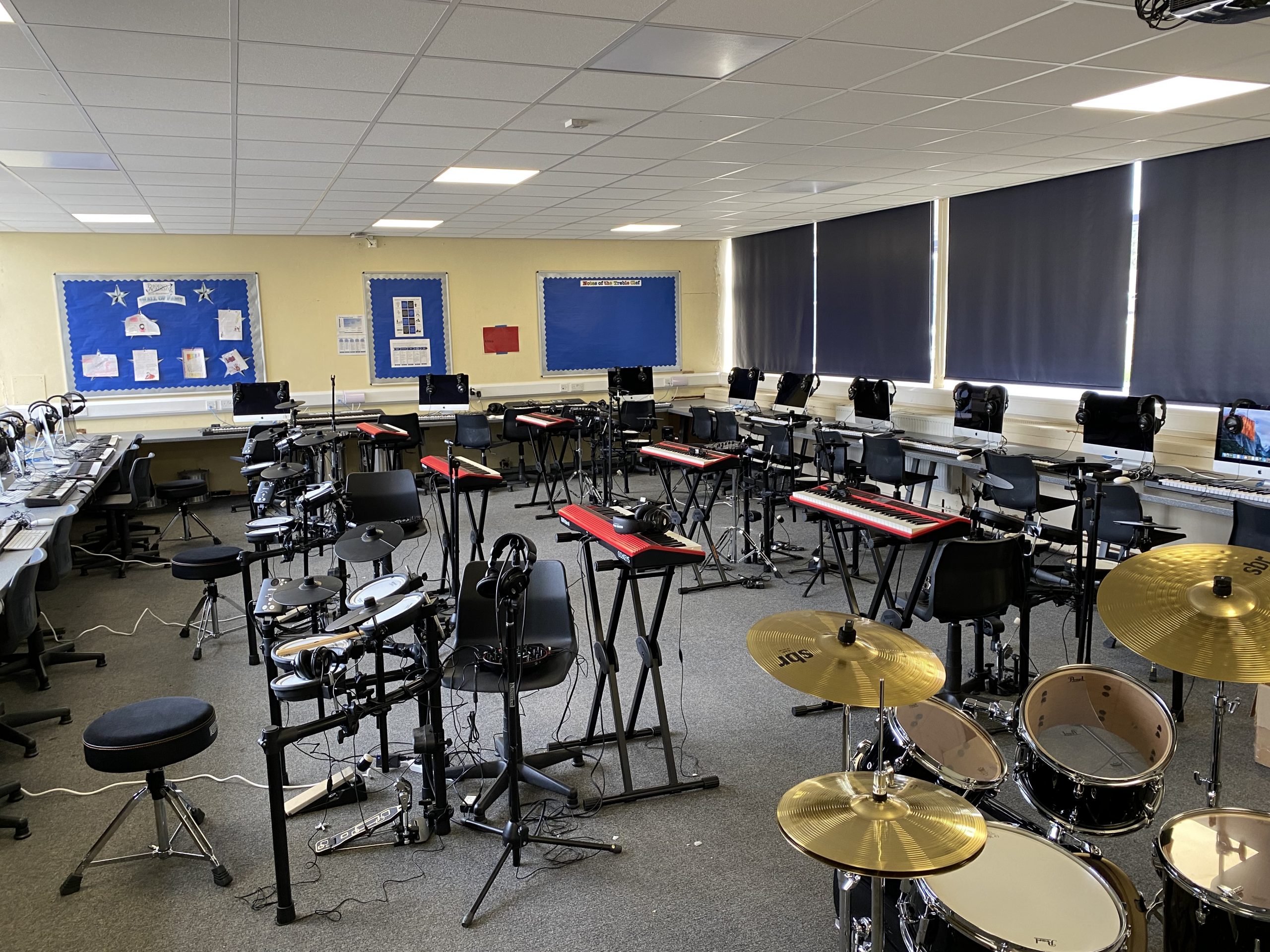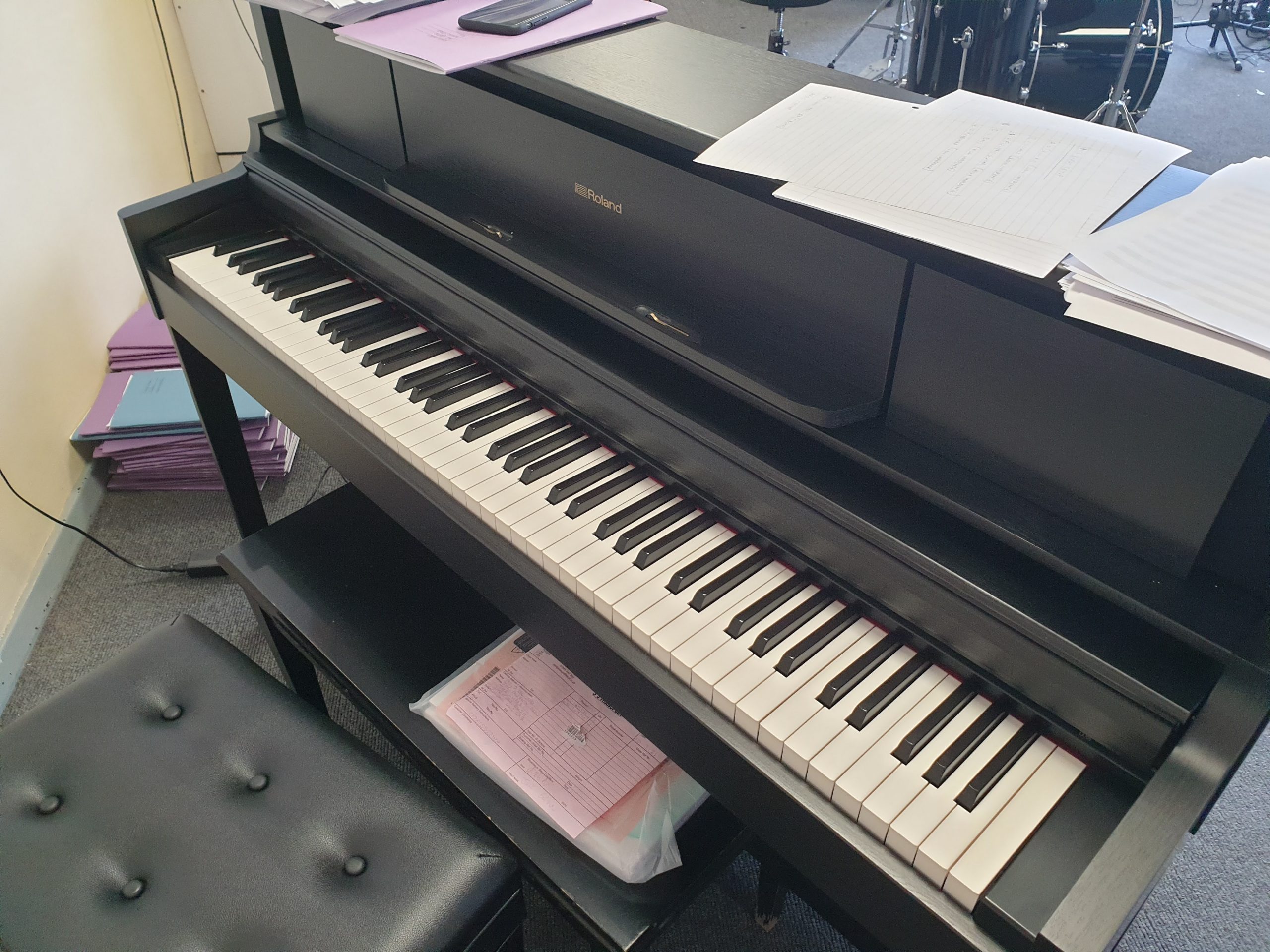 During the Easter holidays we were delighted to spend a day at the Phoenix Academy in West London. Last year, the school received £20k of funding from Restore the Music UK. Due to the lockdown, the setting up of the instruments had been delayed. The school purchased a range of equipment including new pianos, an acoustic drumkit, and six ‘silent rehearsal’ kits comprising of the Roland HS-5, TD-1DMK V-Drums, Go Keys, electric and bass guitars, and vocal microphones. Additional items included stools, stands, a PreSonus AR12C mixer and two Air 12 PA speakers (so that all the work of individual bands could be shared in the classroom) and all the associated cabling.